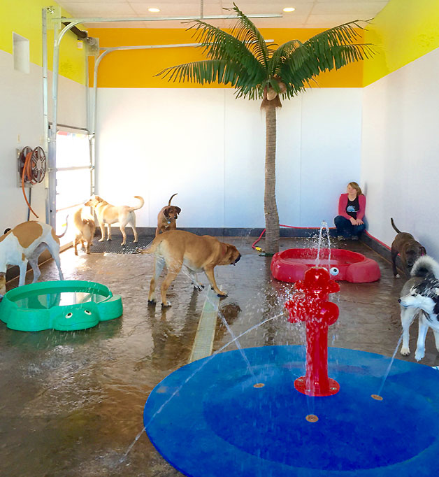We are proud to announce our newest daycare room includes an indoor splash park for dogs!